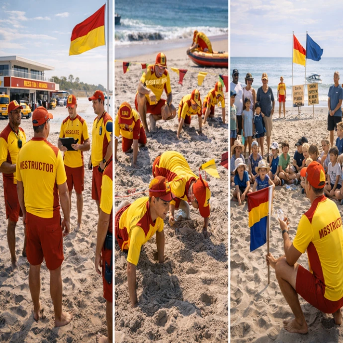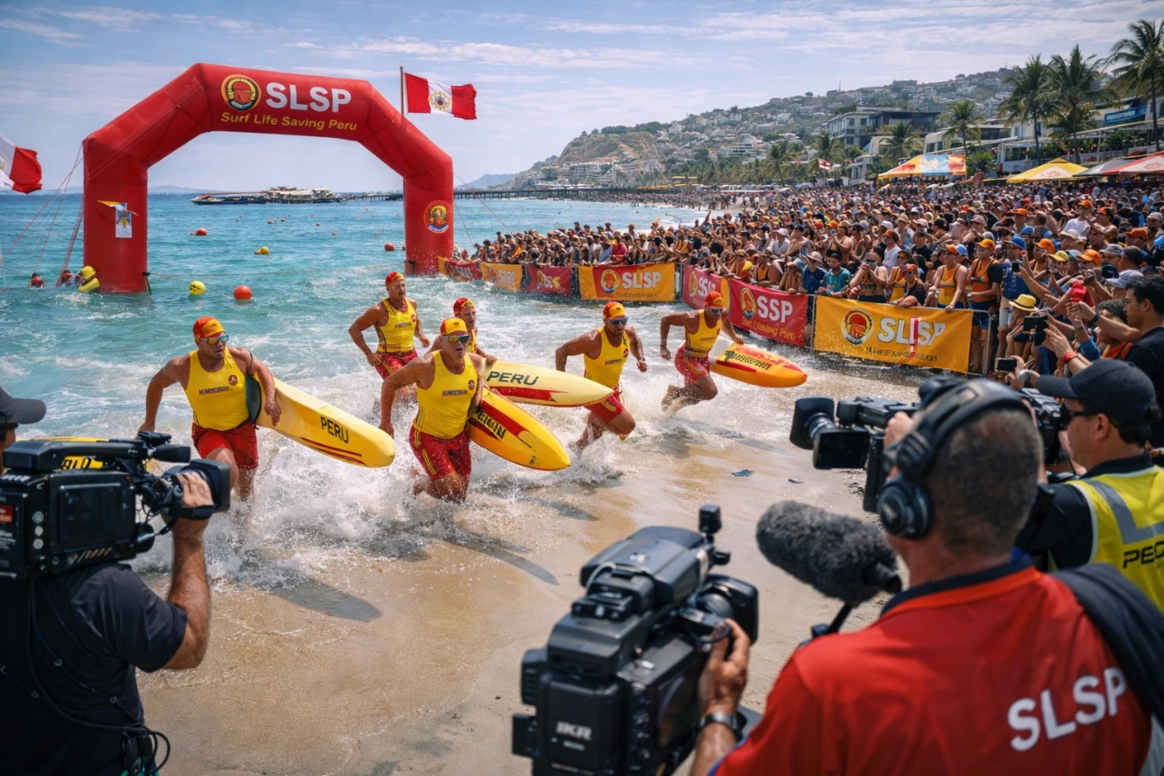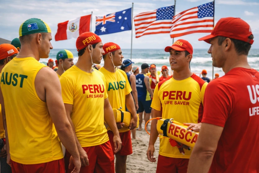 Peruvian lifesavers train alongside international teams on a beach. National colours are visible, and the mood is focused and aspirational, reflecting readiness for global participation.